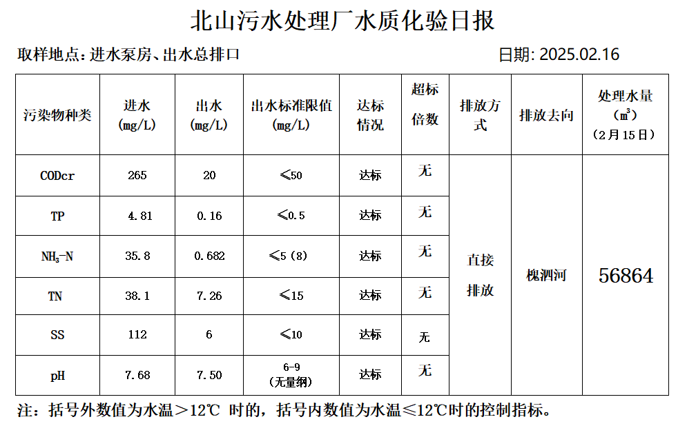 北山污水处理厂水质化验日报(2025.2.16)