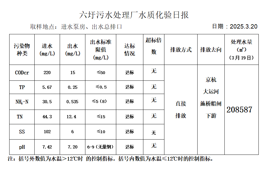 六圩污水处理厂水质化验日报(2025.3.20)
