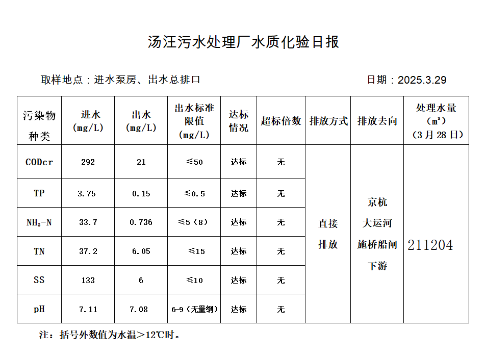 汤汪污水处理厂水质化验日报(2025.3.29)