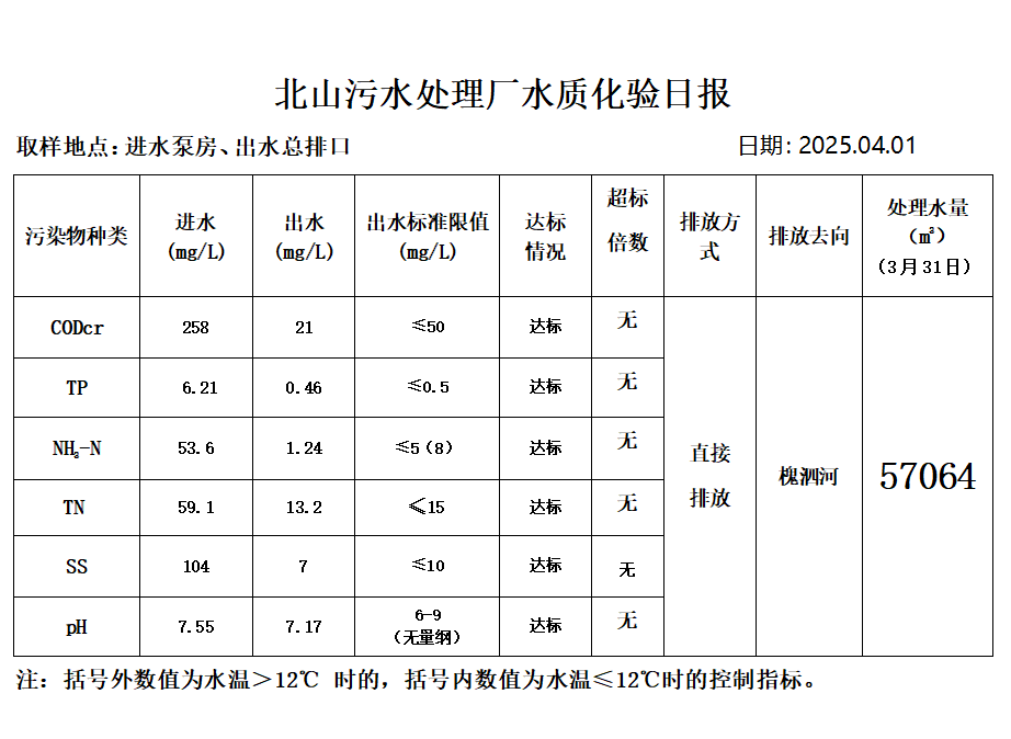 北山污水处理厂水质化验日报(2025.4.1)