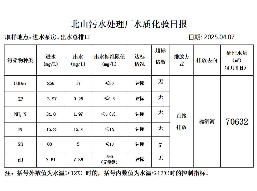 北山污水处理厂水质化验日报(2025.4.7)