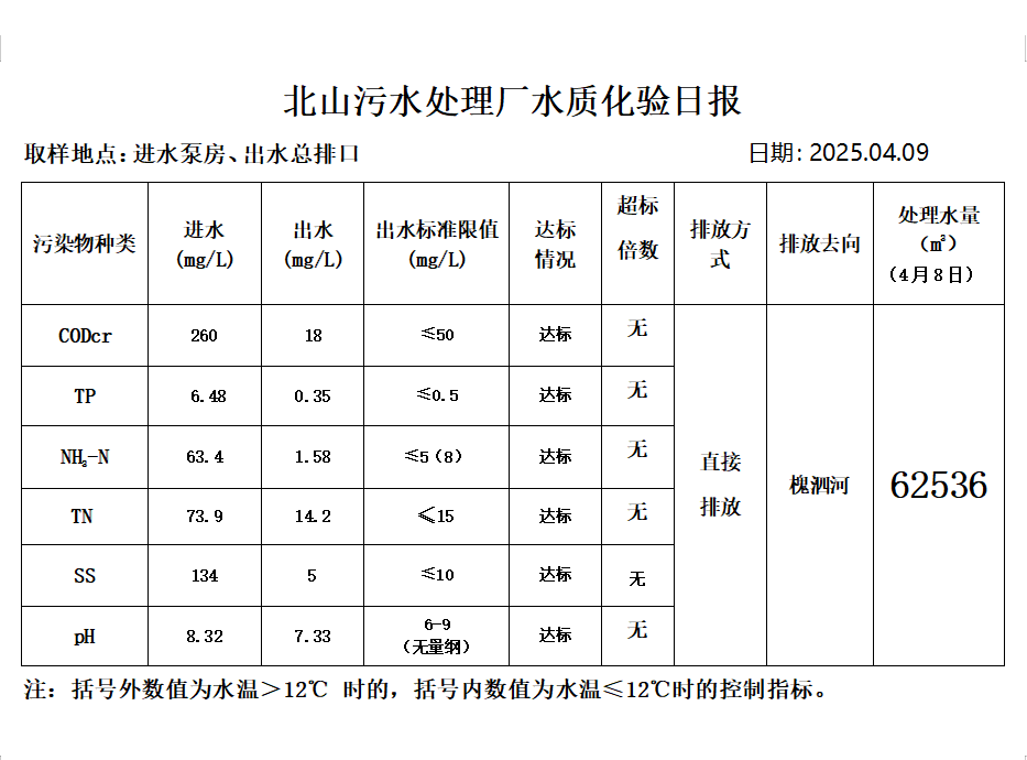 北山污水处理厂水质化验日报(2025.4.9)