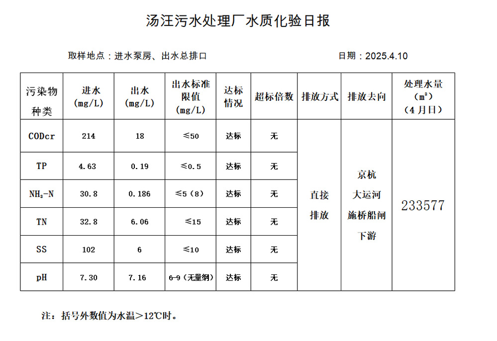 汤汪污水处理厂水质化验日报(2025.4.10)