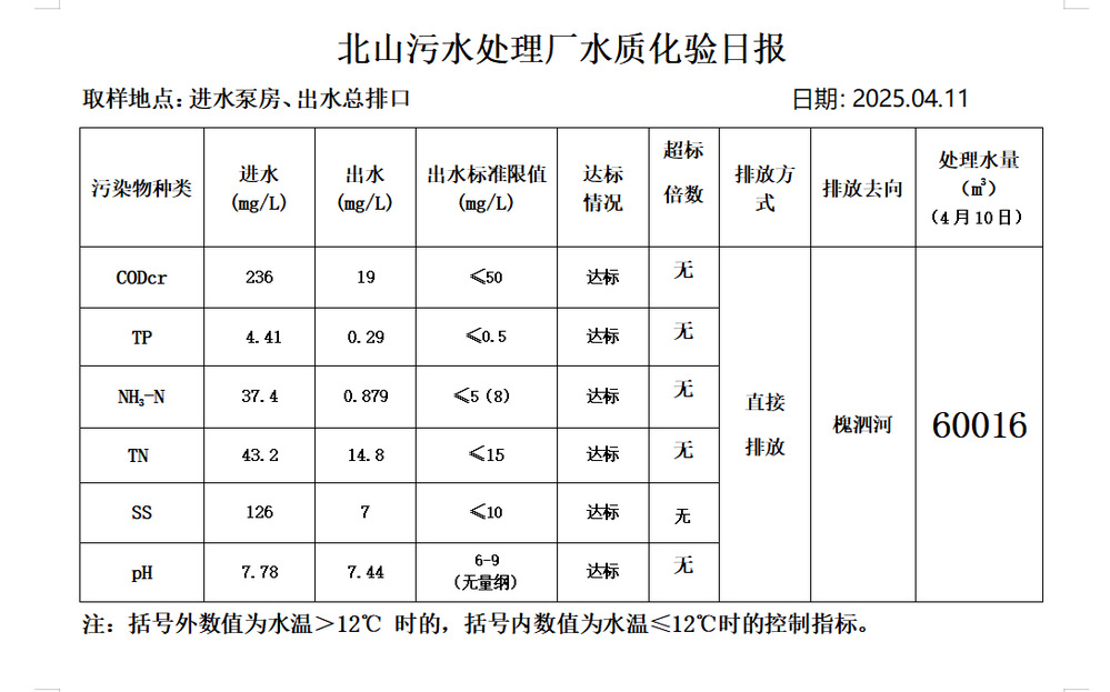 北山污水处理厂水质化验日报(2025.4.11)