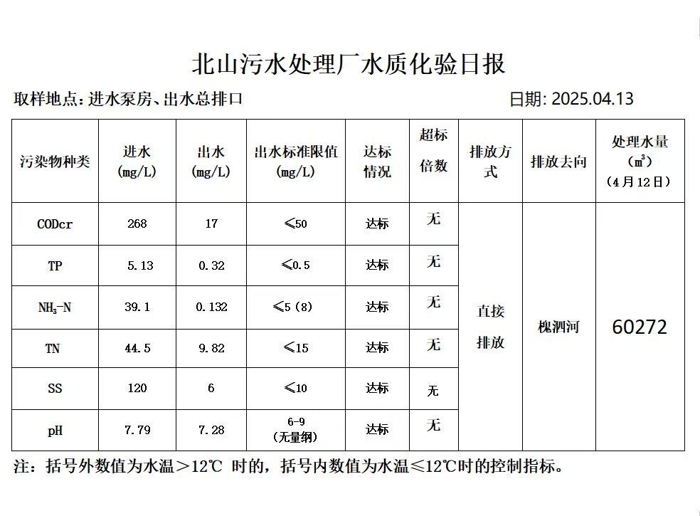 北山污水处理厂水质化验日报(2025.4.13)