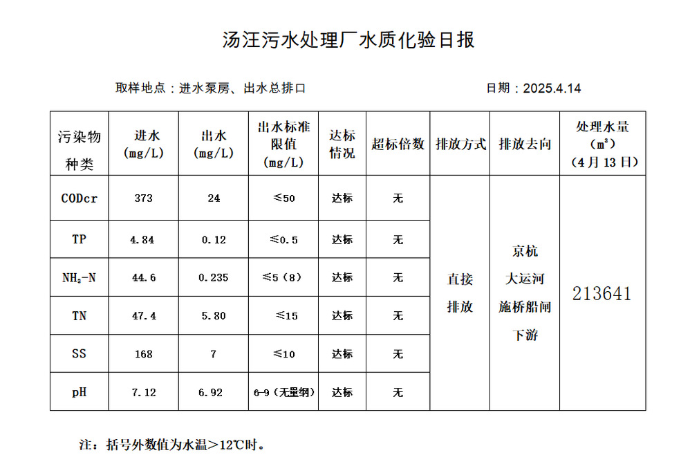 汤汪污水处理厂水质化验日报(2025.4.14)