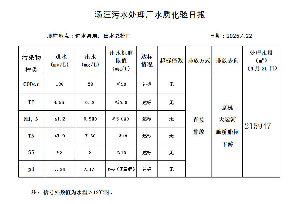 汤汪污水处理厂水质化验日报(2025.4.22)