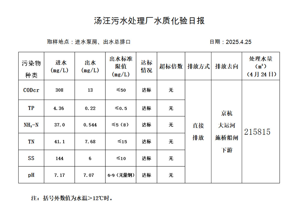 汤汪污水处理厂水质化验日报(2025.4.25)