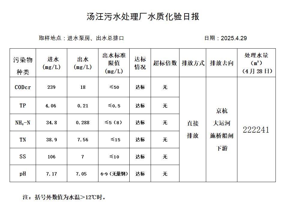 汤汪污水处理厂水质化验日报(2025.4.29)