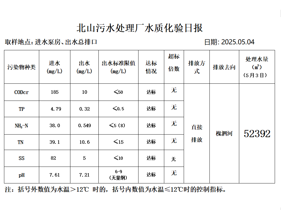 北山污水处理厂水质化验日报(2025.5.4)