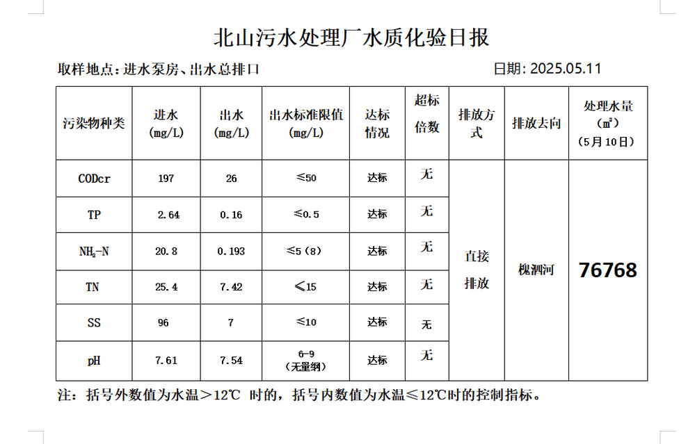 北山污水处理厂水质化验日报(25.5.11)