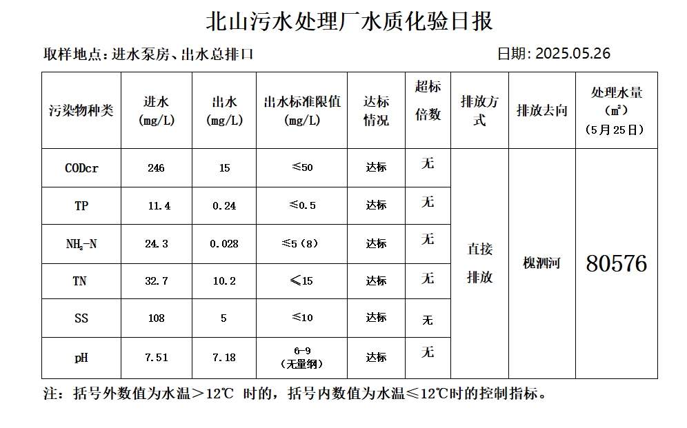 北山污水处理厂水质化验日报(25.5.26)