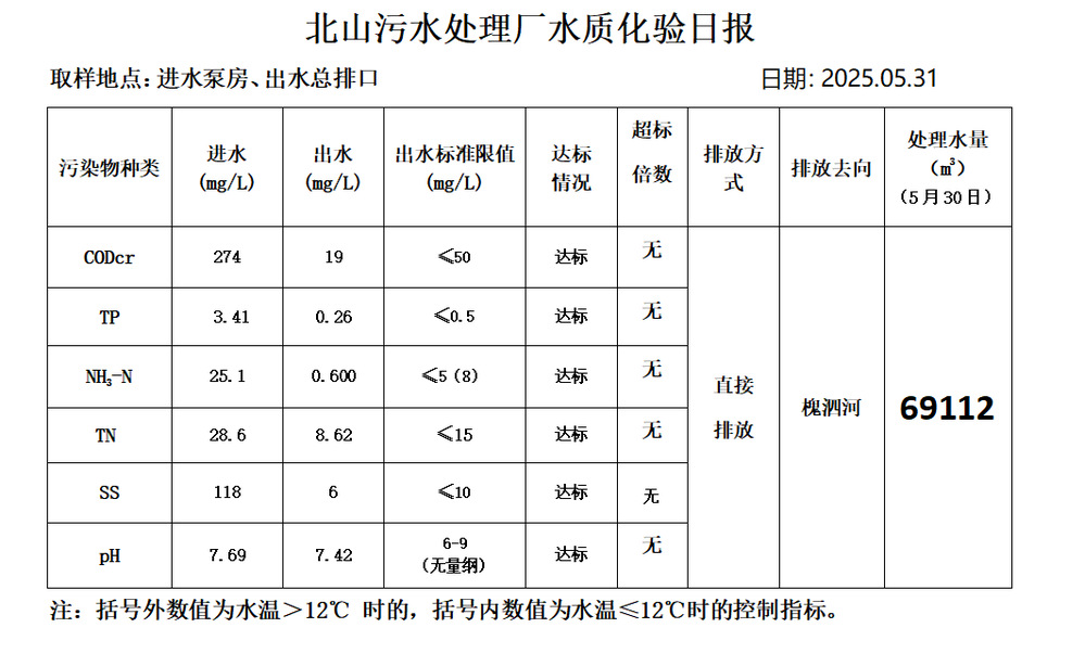 北山污水处理厂水质化验日报(25.5.31)