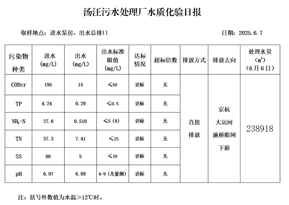 汤汪污水处理厂水质化验日报(25.6.7)