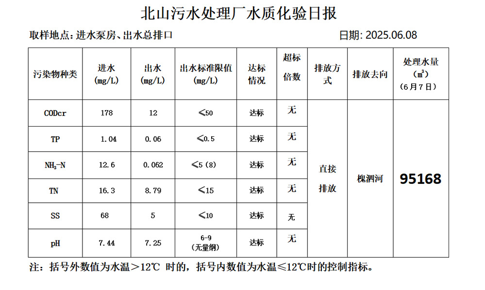 北山污水处理厂水质化验日报(25.6.8)