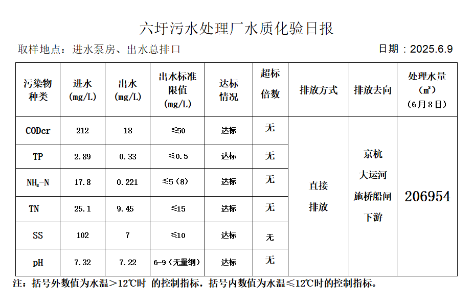 六圩污水处理厂水质化验日报(25.6.9)