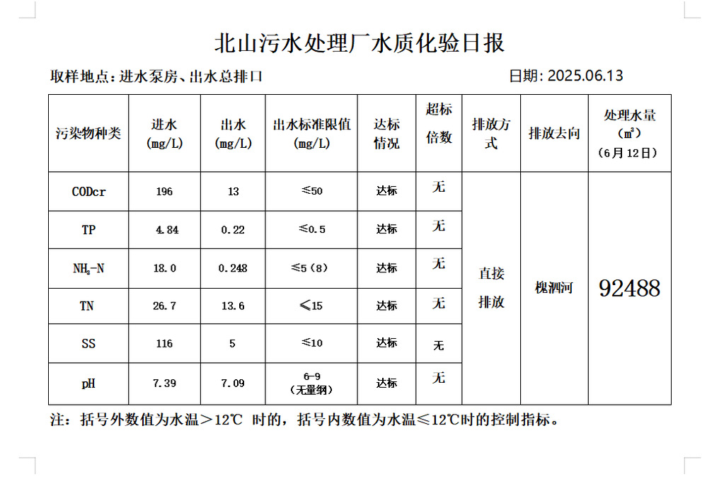 北山污水处理厂水质化验日报(25.6.13)