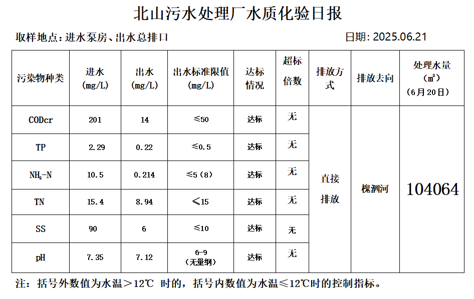 北山污水处理厂水质化验日报(25.6.21)