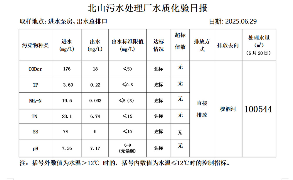 北山污水处理厂水质化验日报(25.6.29)