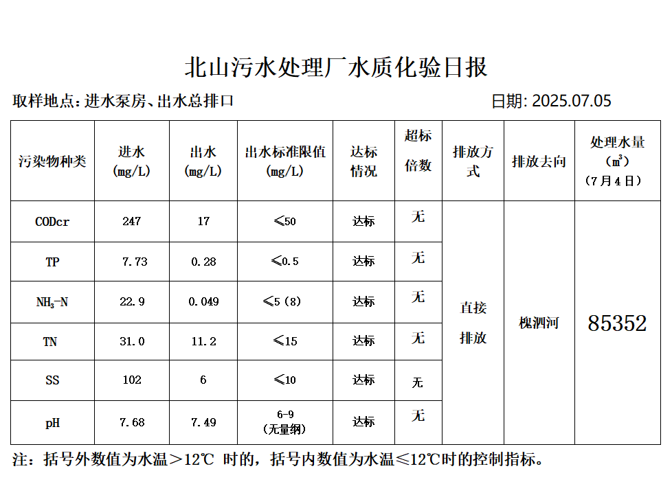 北山污水处理厂水质化验日报(25.7.5)