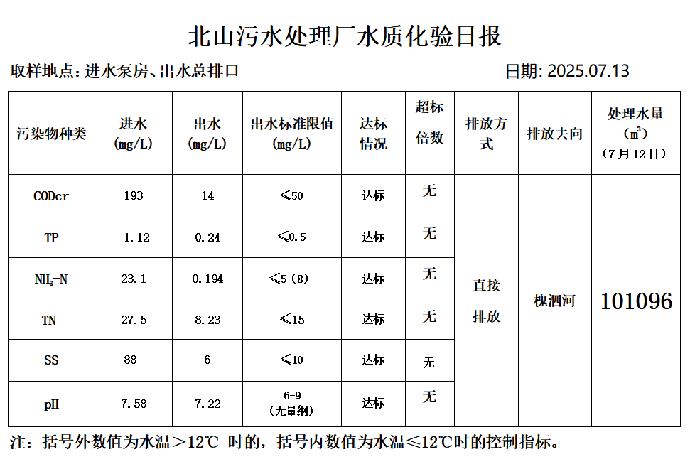 北山污水处理厂水质化验日报(25.7.13)