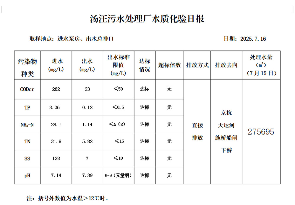 汤汪污水处理厂水质化验日报(25.7.16)