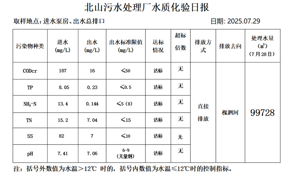 北山污水处理厂水质化验日报(25.7.29)