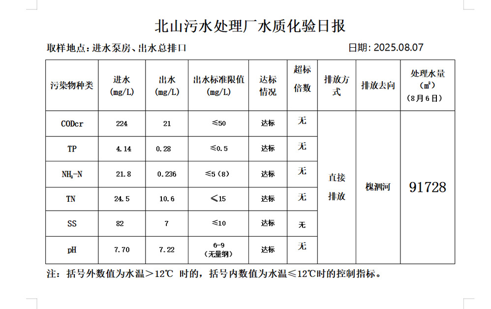 北山污水处理厂水质化验日报(25.8.7)