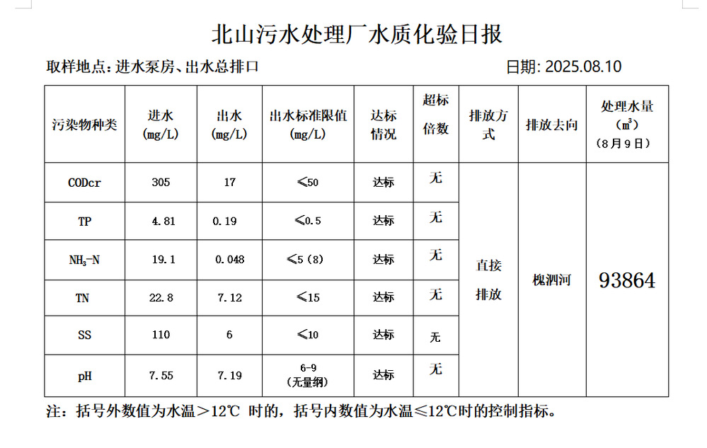 北山污水处理厂水质化验日报(25.8.10)