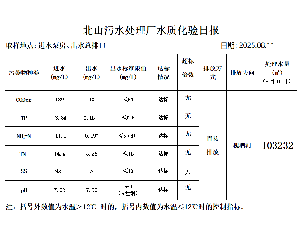 北山污水处理厂水质化验日报(25.8.11)