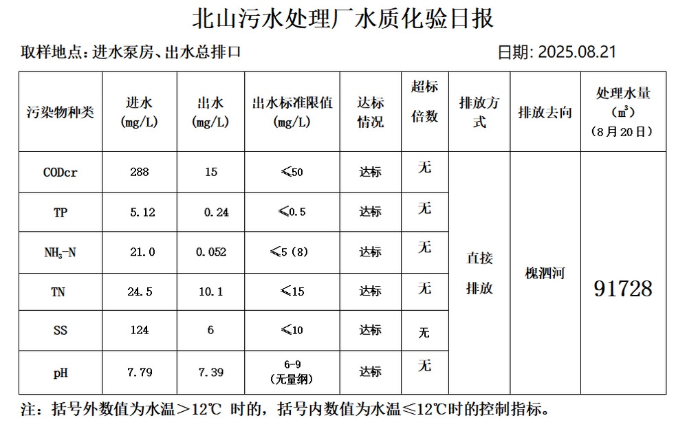 北山污水处理厂水质化验日报(25.8.21)