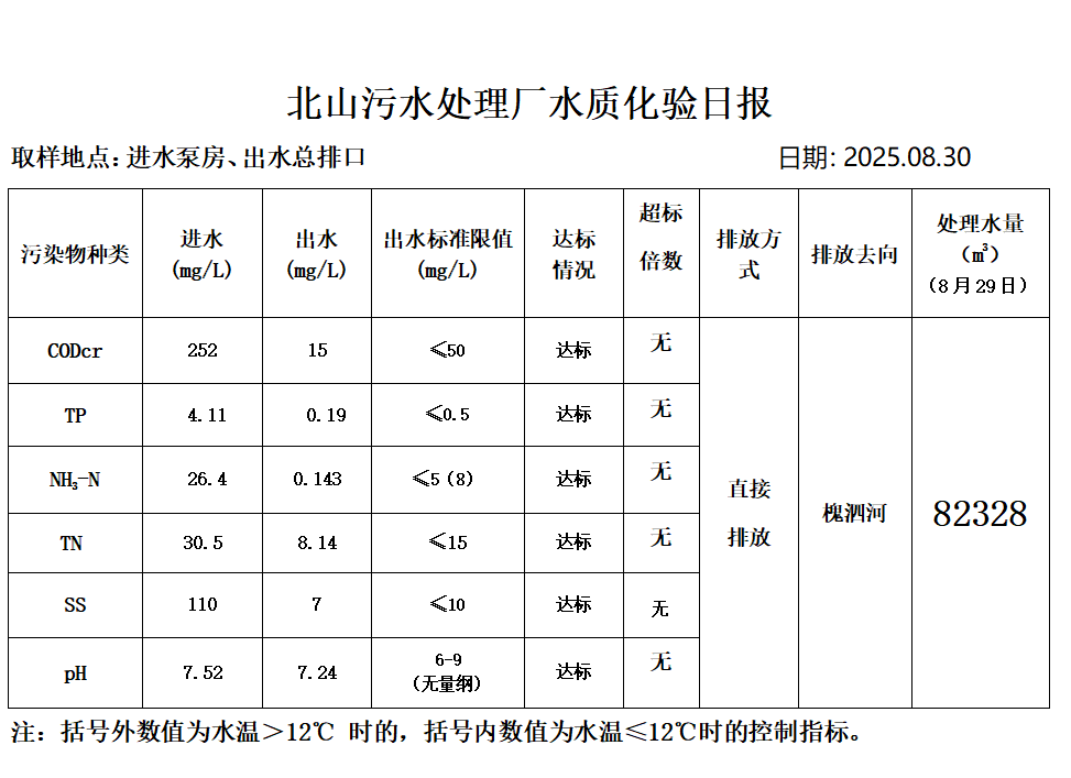 北山污水处理厂水质化验日报(25.8.30)
