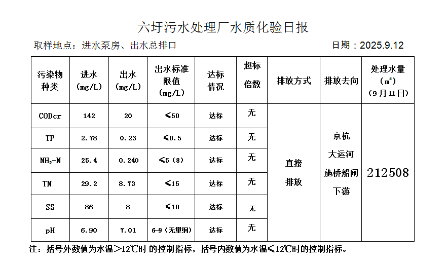 六圩污水处理厂水质化验日报(25.9.12)