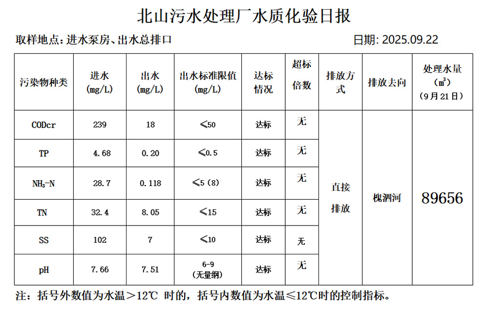 北山污水处理厂水质化验日报(25.9.22)
