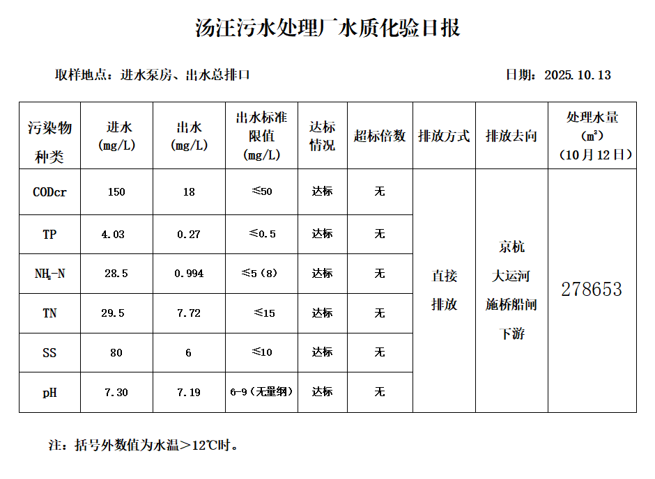 汤汪污水处理厂水质化验日报(25.10.13)
