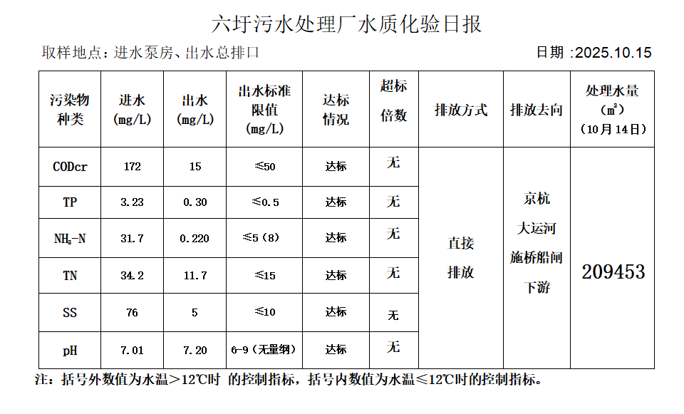 六圩污水处理厂水质化验日报(25.10.15)
