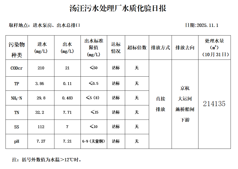 汤汪污水处理厂水质化验日报(25.11.1)